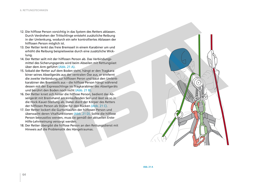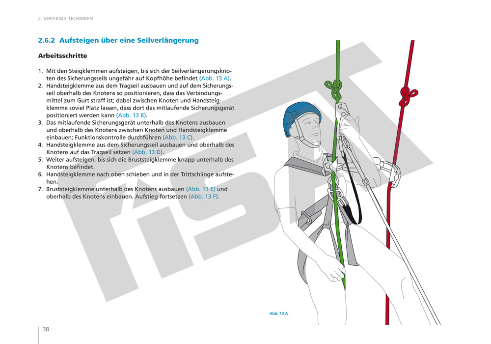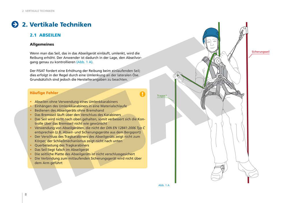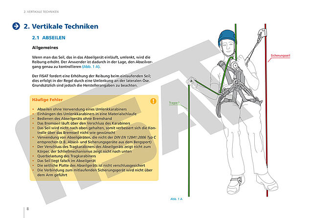 FISAT is the first rope access association to publish a complete step-by-step manual for all basic rope access maneuvers and rescue drills technicians have to learn and internalize in order to be fully operational. Due to the regional presence in Germany, Austria and Switzerland, the manual is only available in German. The handbook is divided into five main chapters: vertical, horizontal and diagonal access, rescue techniques, as well as rigging.